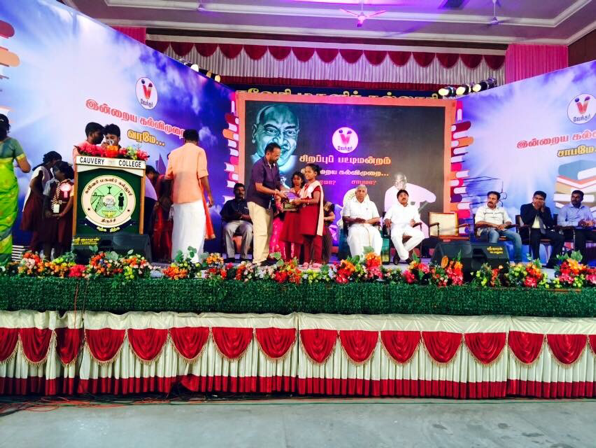 திருச்சி காவேரி மகளிர் கல்லூரியில் இன்று. ( 8/7/2017) வேந்தர் தொலைக்காட்சியின் கல்வி வளர்ச்சி நாள் சிறப்பு பட்டிமன்றம் மற்றும் பேச்சாற்றல் மிகுந்த அரசுப்பள்ளி மாணவர்களுக்கும் , சாதனையாளருக்கும் விருது வழங்கும் விழாநடைப் பெற்றது.இன்றைய கல்வி முறை வரமா? சாபமா? என்ற தலைப்பில் நடந்த பட்டிமன்றத்தில் நடுவராக 1000 மேடைகள் களம் கண்ட உரத்த சிந்தனையாளர் திருமதி சபரிமாலா ஜெயகாந்தன் அவர்கள் தலைமை தாங்கினார் . இன்று திருச்சியை அதிர வைத்த பட்டிமன்றத்தில் காவேரி மகளிர் கல்லூரி மாணவிகள் 5000 பேர் கலந்துக்கொண்டனர் . பட்டிமன்றத்தின் முடிவில் ஒரு ஒன்றியத்திற்கு ஒரு பேச்சாற்றல் மிகுந்த அரசுப்பள்ளி மாணவன்அல்லது மாணவியை தேர்வு செய்து விருது வழங்கியது அனைவருக்கும் மிகுந்த மகிழ்ச்சியைத்தந்நது.